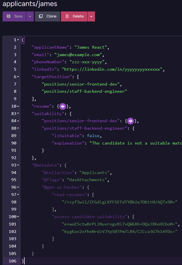 You can see the metadata for the two tasks (which we use to avoid going to the model again when we don’t have to), as well as the actual outputs of the model (resume, suitability fields).