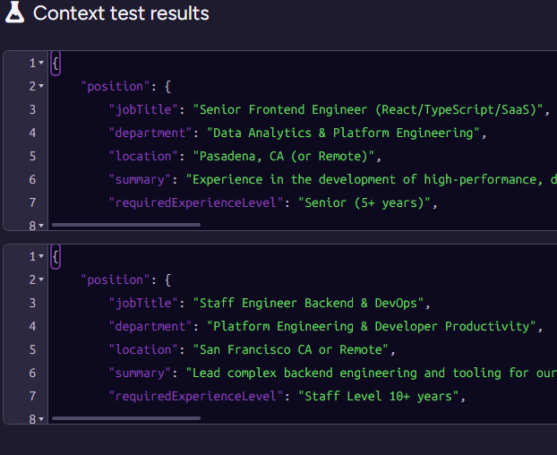Next, note that we output multiple contexts for the same document. Here is what this looks like for James, we have two separate contexts, one for each position James applied for: